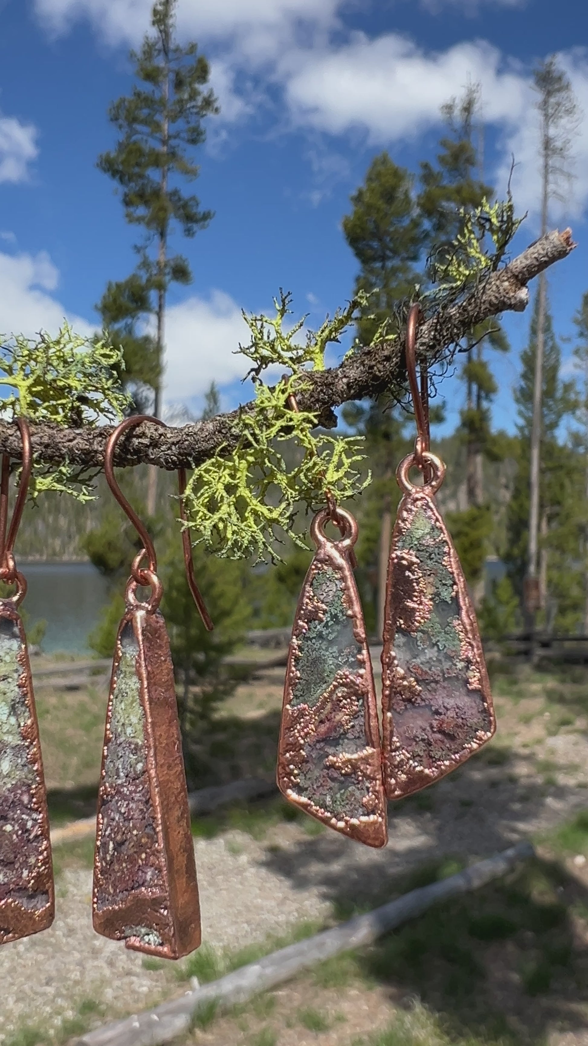 These amazing moss agate stones have so much depth in them, they really are like looking into a tiny secret garden. Set in pure copper which is hypoallergenic, and very lightweight and easy to wear. Nearly 2 inches long.