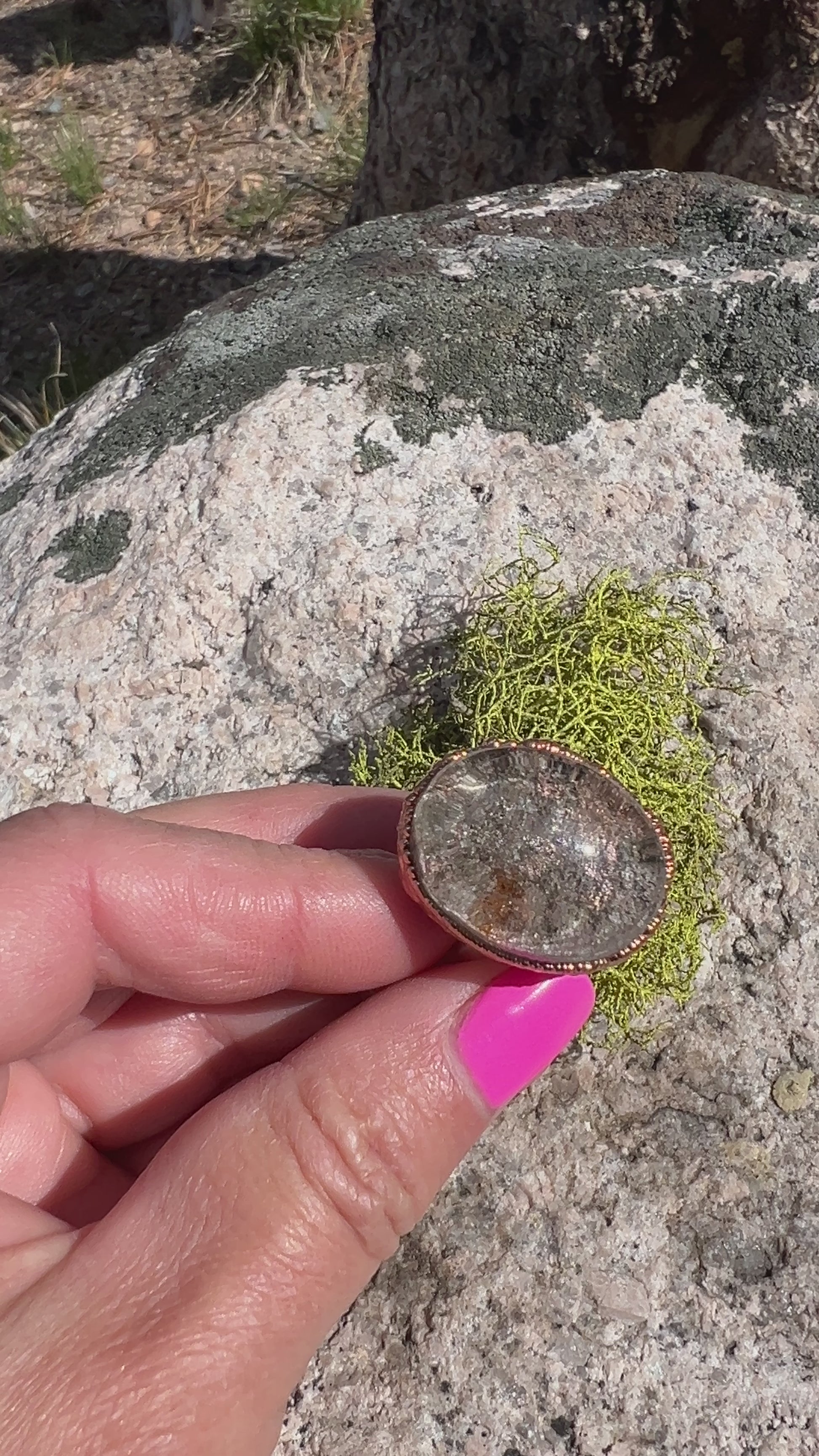 This incredible garden quartz stone is set in pure copper, with a sterling silver band. The stone has a very high dome, it almost seems like a snowglobe! The "moss" inside has shades of rose, rust, and silver. This ring is a size 6, but can be stretched up as high as a size 7 1/2.