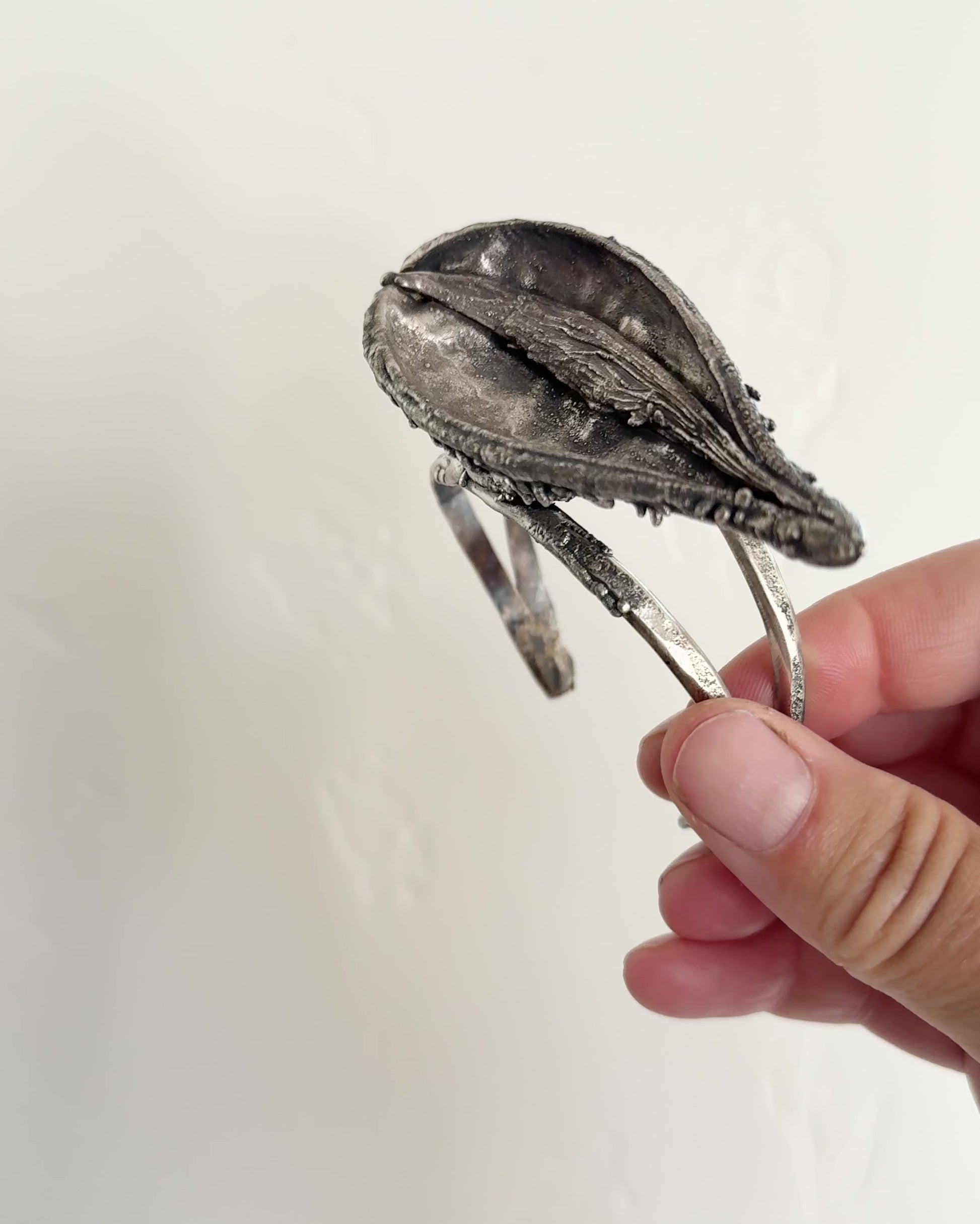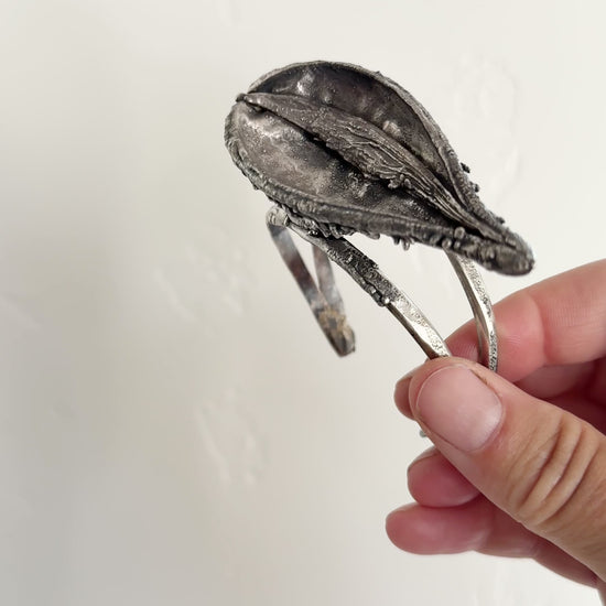 This stunning cuff celebrates the vital bond between milkweed and monarch butterflies. Milkweed plants are the only host for monarch caterpillars, providing the leaves they need to grow and thrive before their transformation. Featuring a real milkweed pod electroformed in silver, the cuff honors this delicate, life-giving relationship with rugged elegance. The sterling silver band frames the organic form, making it a powerful symbol of resilience, growth, and natural beauty worn on your wrist.