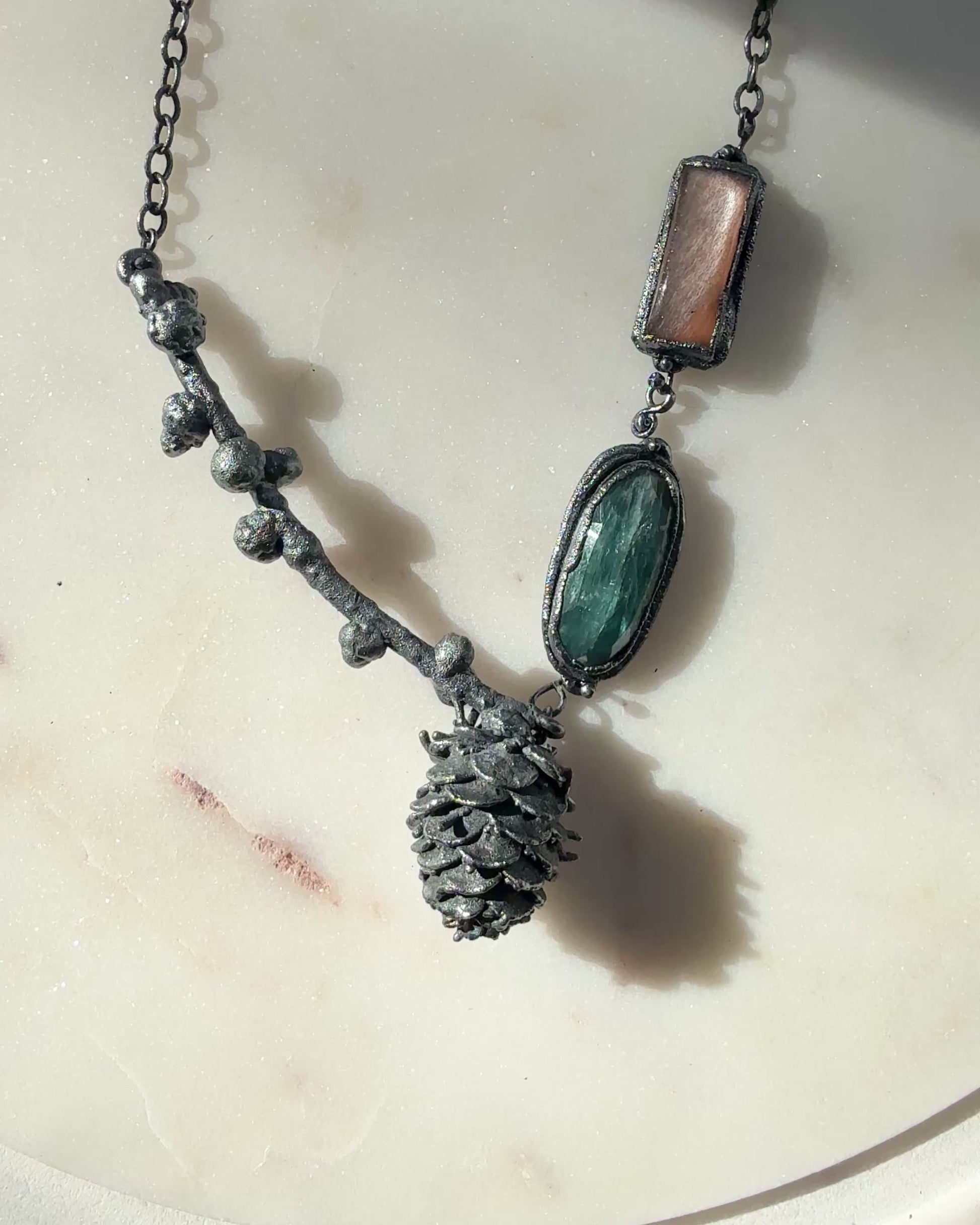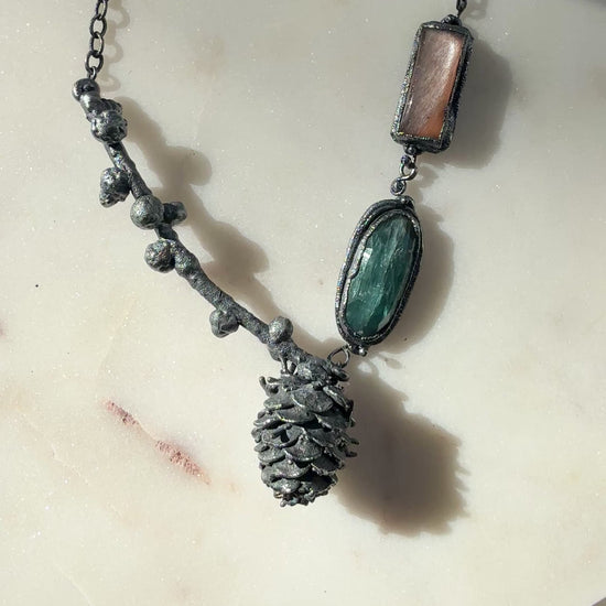 Materials: Real pine cone and twig, electroformed silver with blackened patina, teal kyanite, peach sunstone