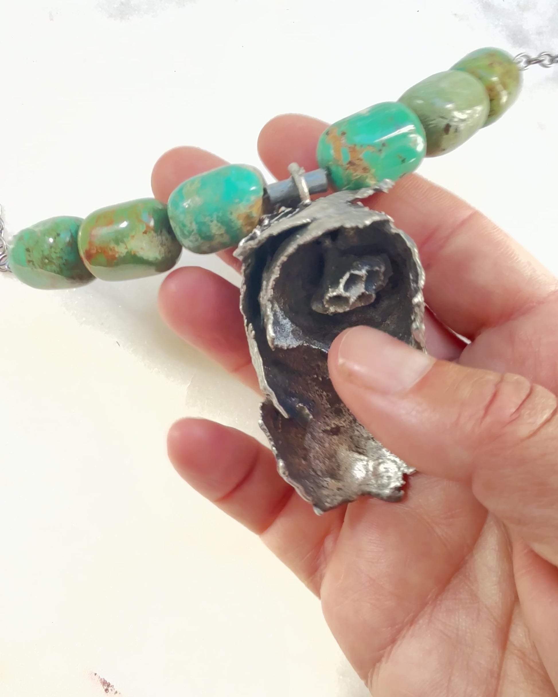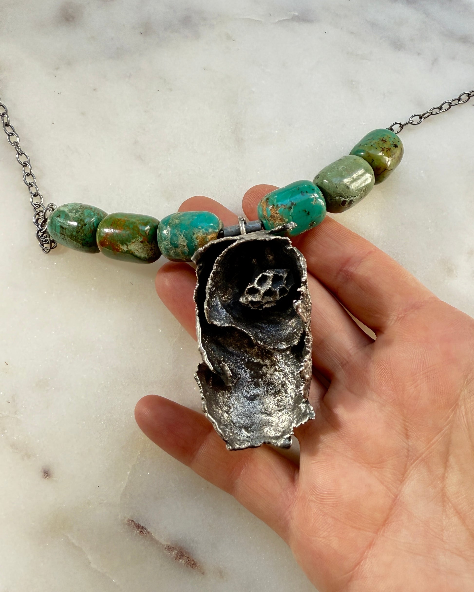 Fierce. Unapologetic. One of a kind. This necklace features a real wasp nest, electroformed in silver to immortalize its raw, geometric beauty. Striking turquoise beads add a bold pop of color, while the sterling silver chain keeps it grounded in effortless style. This is jewelry for the woman who owns her power and wears it like armor. 18" overall length, but can be hooked on any link.